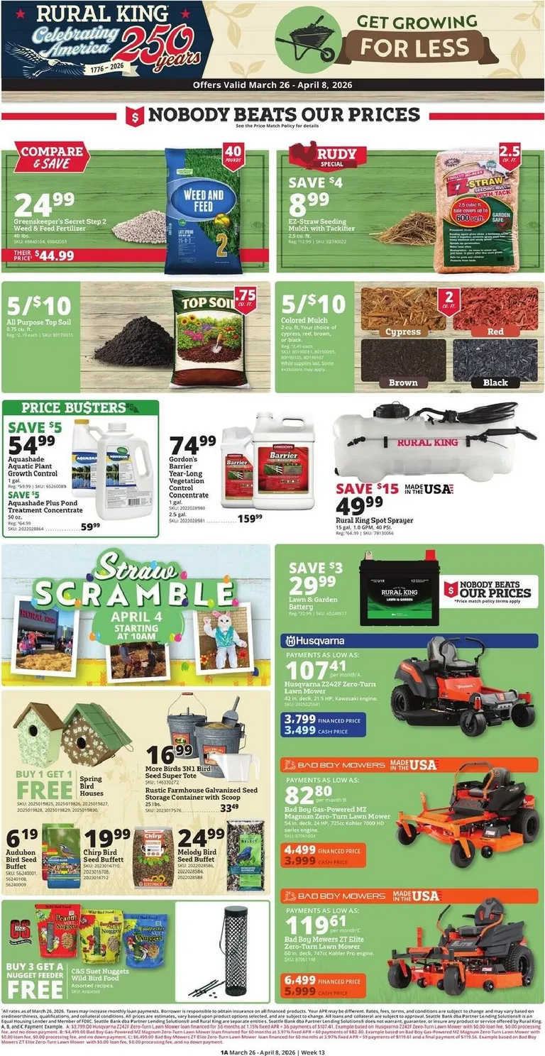 You’re viewing the Rural King weekly ad, valid from 03/26/2026 to 04/08/2026. Visit our website regularly to stay up to date with the latest deals and promotions from your favorite stores.